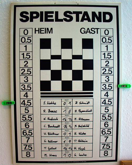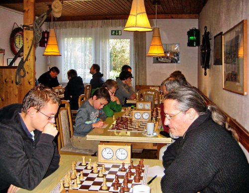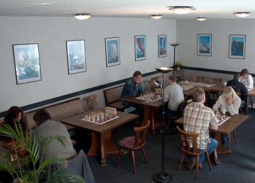 Nach 2 Runden führte etwas überraschend Andreas Papendieck, da DWZ-Favourit Hartmut Höckendorf in der 2.Runde mit Schwarz gegen Martin Hufschild nicht über ein Unentschieden hinaus kam. Die Führung bedeutete für Andreas nun auch am ersten Brett spielen zu müssen, was wegen dem eingesetzten DGT-Brett nicht jedem Teilnehmer gefiel. Wegen einer heranziehenden dunklen Wolke beschloß man, dass die restlichen Runden drinnen durchzuführen. Gegen den Schreiber dieser Zeilen setzte sich Andreas in Runde 3 durch, auch weil ich in dem Turnier erschreckend viel Material einstellte und sogar ein einzügiges Matt übersah. Zu dem Spitzenkampf in der vierten Runde Papendieck gegen Höckendorf kam es jedoch wegen Farbausgleich noch nicht.