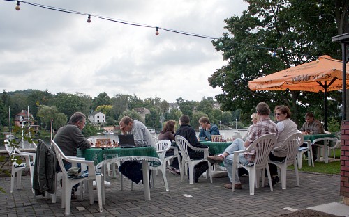 Am letzten Augustsamstag fand dieses Jahr unser Schnellschachturnier statt. Neben den Vereinsmitgliedern konnten wir 3 Schachspieler aus anderen Vereinen begrüßen. Neben dem ortsansässigen Hartmut Höckendorf, der für Pneumant Fürstenwalde in der Landesliga spielt, kamen auch 2 Spieler aus Ludwigsfelde: Rene Schilling und Jens-Uwe Meyer. Parallel zu unserem Turnier fand -wie auch schon im letzten Jahr- eine Regatta vom SC Flakensee statt. Den Wetterprognosen zum Trotz wurde das Turnier im Freien begonnen.