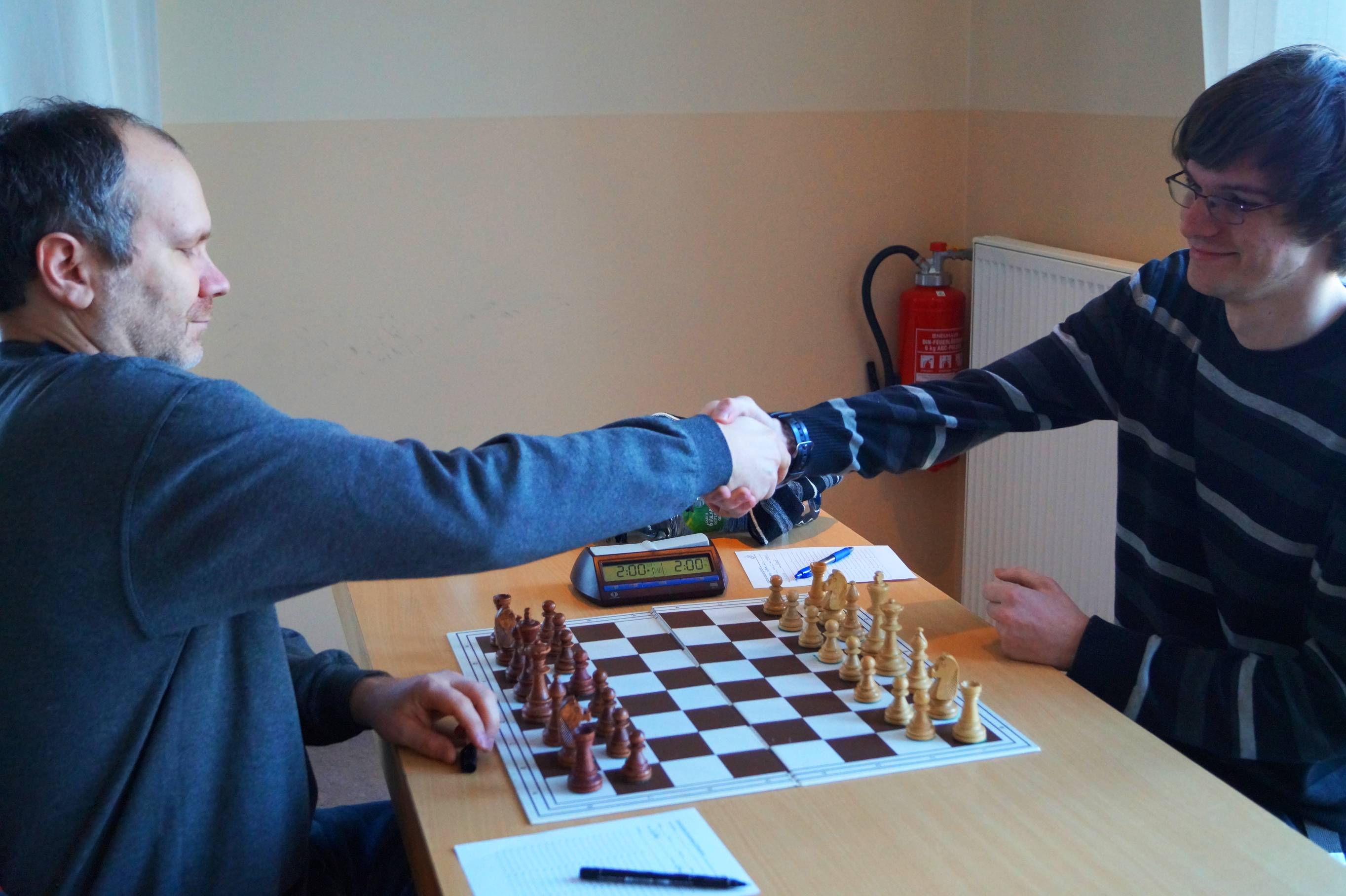 Pape brachte uns also 1:0 in Führung und kam damit meiner Aufgabe zuvor. Was auch daran lag, daß ich noch rund zehn Züge lang Spaß an Schmerzen haben wollte. So kam mir auch Tino mit seinem Remis noch dazwischen:
