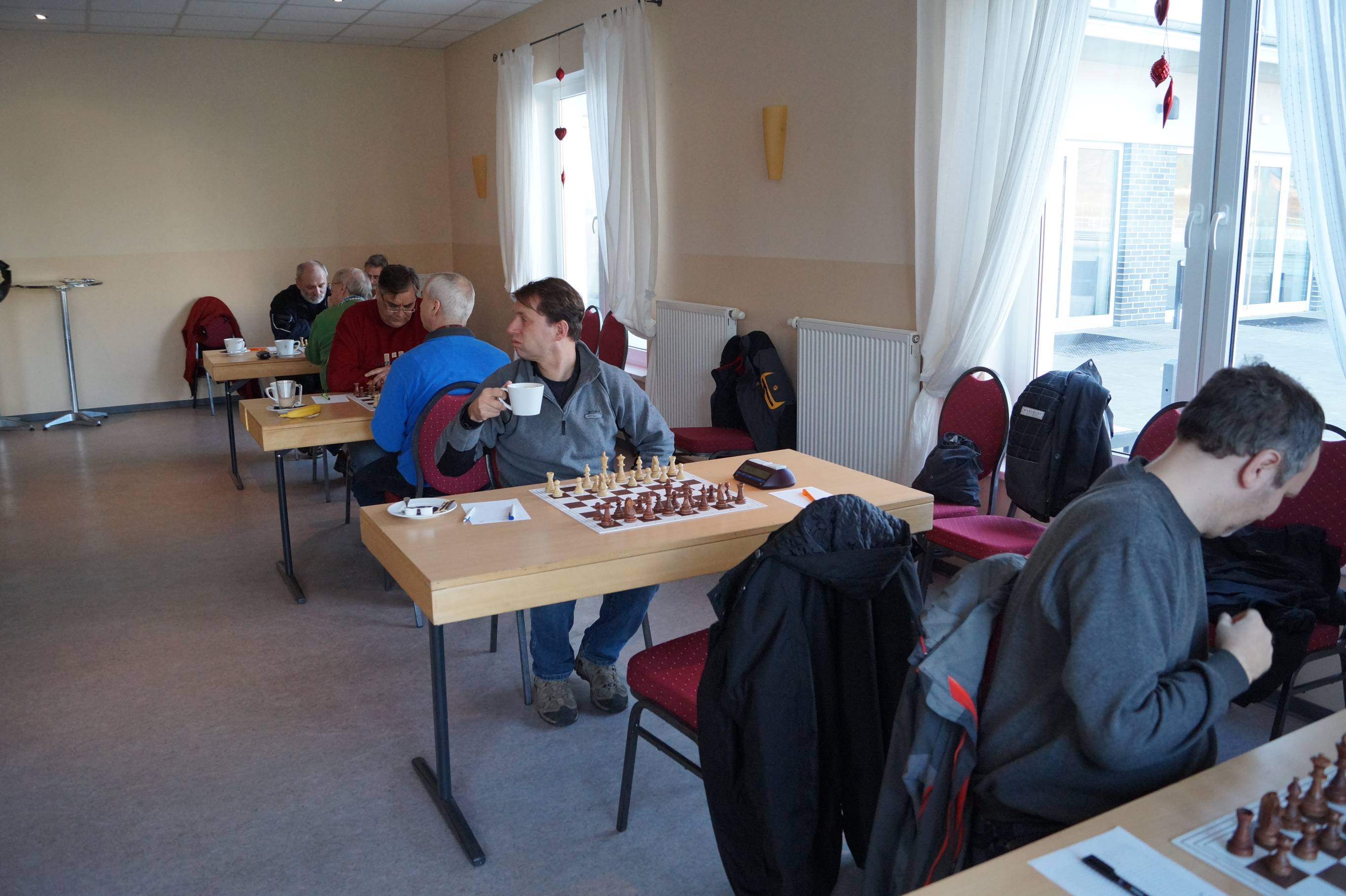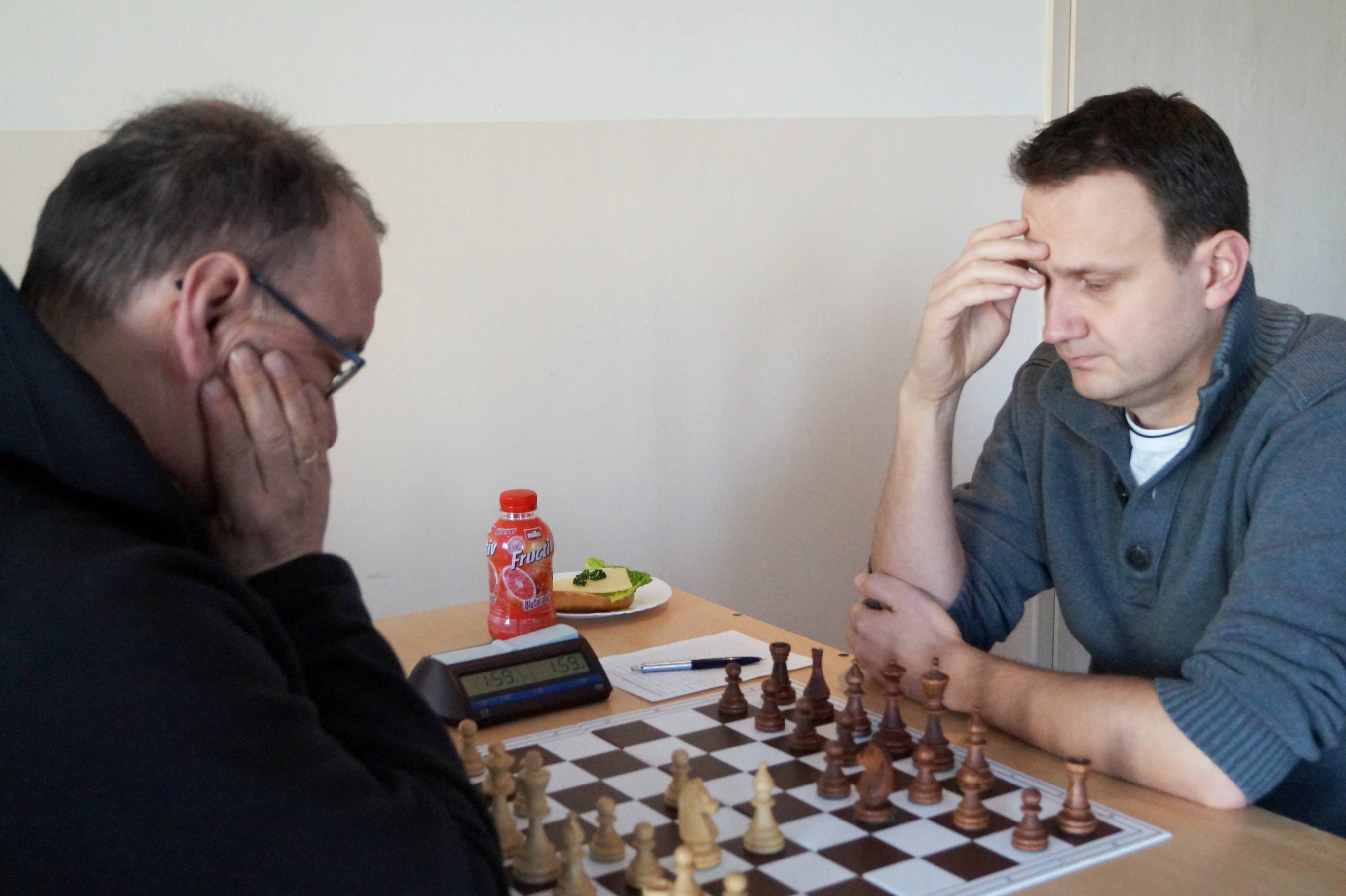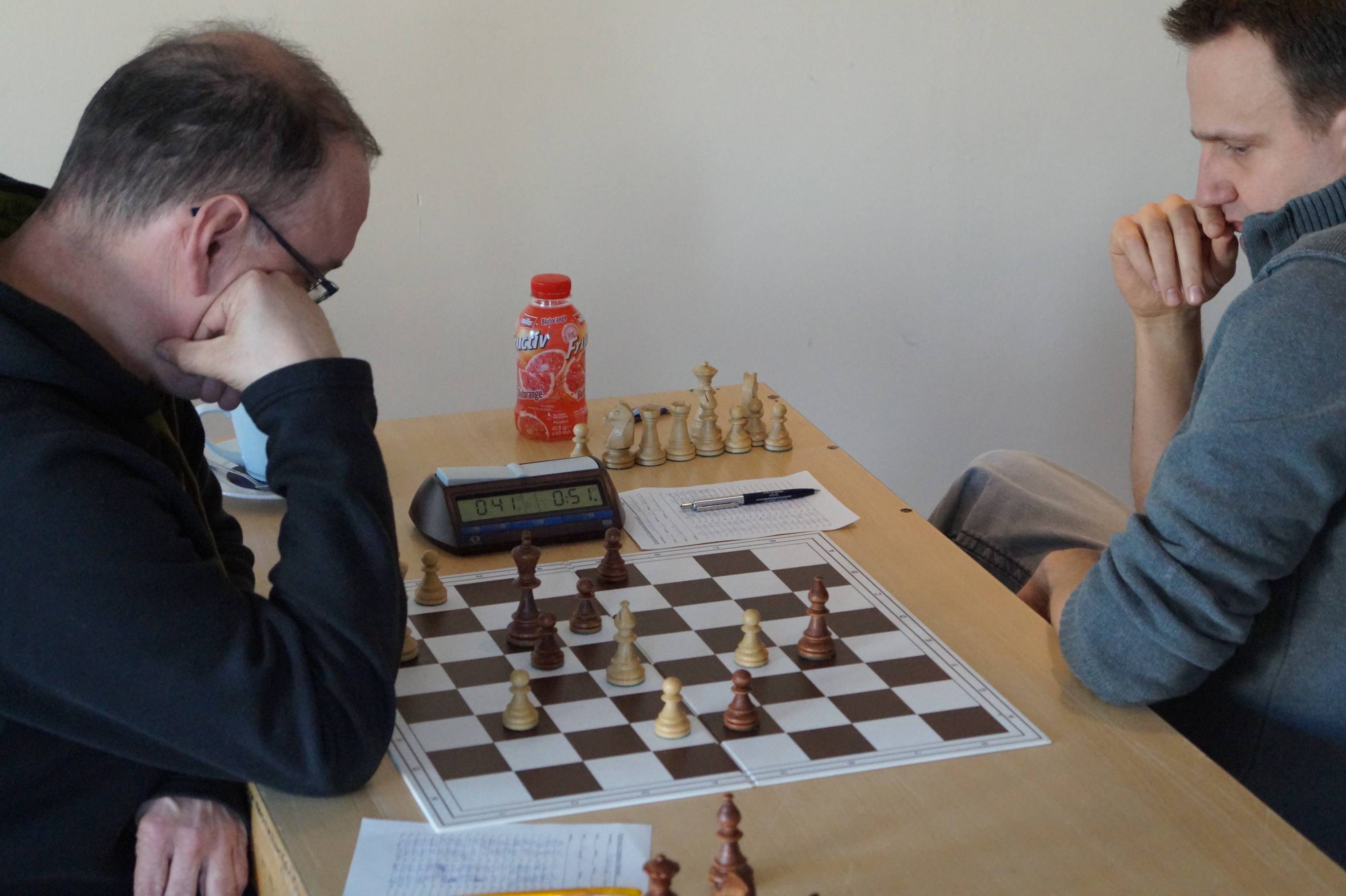Drei Partien liefen noch und die Gäste führten 3:2. Mit zunehmender Zeit wurden die Hoffnungen immer größer, daß wir mindestens ein 4:4 wenn nicht sogar ein 4½:3½ schaffen könnten. Bunki stand an Brett acht auf Gewinn, quälte sich aber noch. Daniel stand mit Schwarz auch auf Gewinn, trotz ungleichfarbiger Läufer. Nur Torsten an Brett eins stand etwas unklar. Hier blockierte eine gegenseitige Fesselung die Stellung, doch als Weiß seinen König daraus abzog, wurde es gefährlich für Torstens Monarchen. Zu gefährlich. Zum Ende wehrte er zwar das einzügige Matt ab, lief aber mit seinem König in ein zweizügiges.