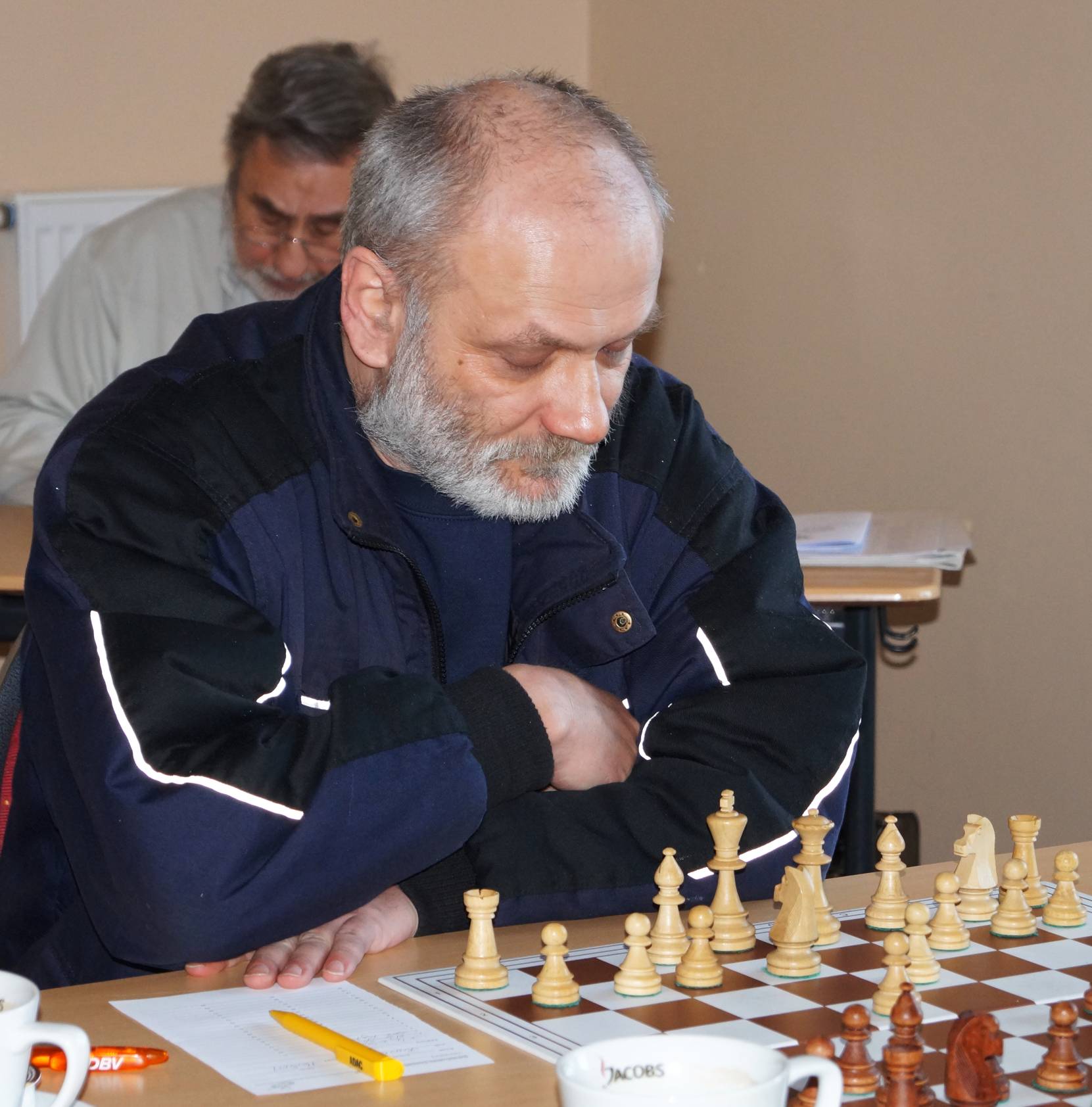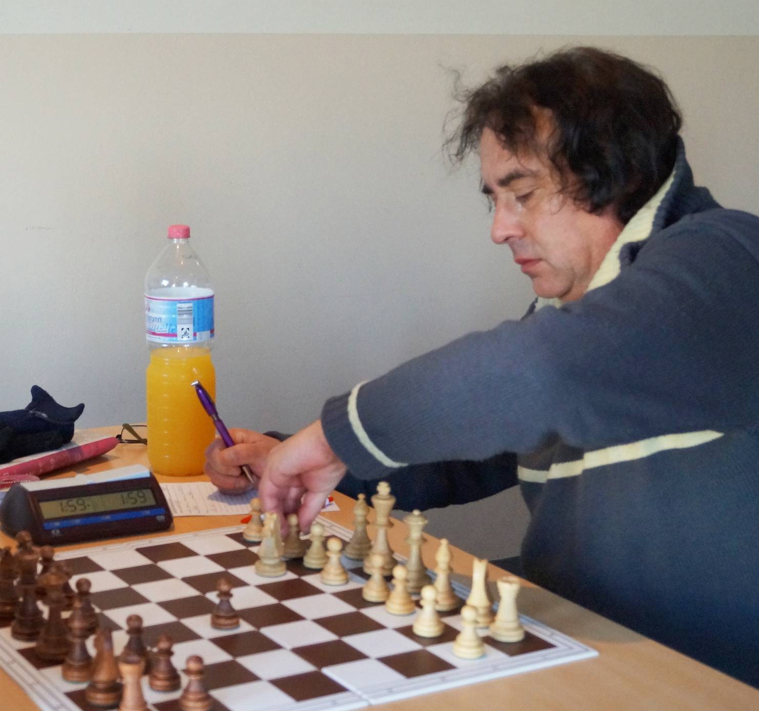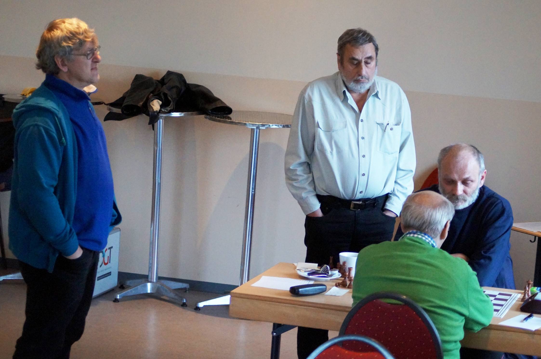 Drei Partien liefen noch und die Gäste führten 3:2. Mit zunehmender Zeit wurden die Hoffnungen immer größer, daß wir mindestens ein 4:4 wenn nicht sogar ein 4½:3½ schaffen könnten. Bunki stand an Brett acht auf Gewinn, quälte sich aber noch. Daniel stand mit Schwarz auch auf Gewinn, trotz ungleichfarbiger Läufer. Nur Torsten an Brett eins stand etwas unklar. Hier blockierte eine gegenseitige Fesselung die Stellung, doch als Weiß seinen König daraus abzog, wurde es gefährlich für Torstens Monarchen. Zu gefährlich. Zum Ende wehrte er zwar das einzügige Matt ab, lief aber mit seinem König in ein zweizügiges.